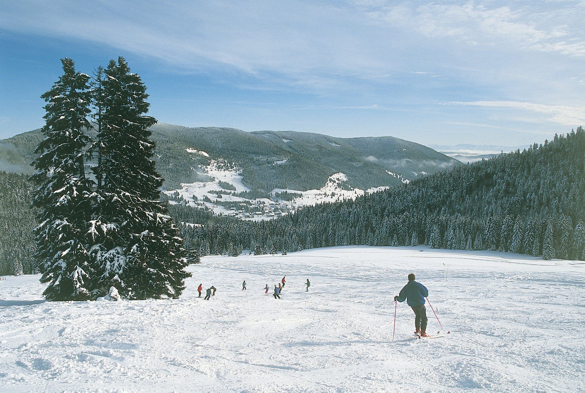 Für Wintersportler ist die SkiArena Spießhorn im St. Blasier Ortsteil Menzenschwand ein Muss. Vom Anfängerlift über Familienabfahrten bis hin zu einem Weltcuphang ist alles vorhanden. Das Foto zeigt den Schwinbachlift mit Blick auf Menzenschwand. Im Hintergrund rechts oben sind die Alpen sichtbar.